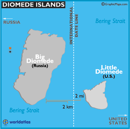 Las Islas Diomedes, la de la izquierda pertenece a Estados Unidos y la de la derecha a Rusia, la línea internacional de cambio de fecha (FECHA, NO FLECHA) pasa por enmedio, es así de friki, en una es lunes y en la otra domingo,en una ya es 2011 y en la otra será 2010 durante 24 horas más.